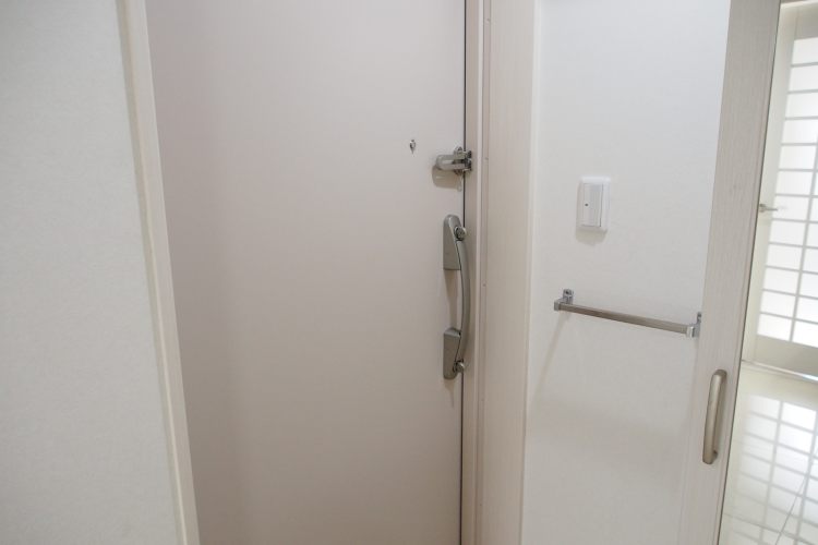 気になったのは居室内のデザイン。入ってすぐにかわいい。と声があがってしまう、真っ白な床と壁にピンク色のトイレや独立洗面台、青色のキッチン。
