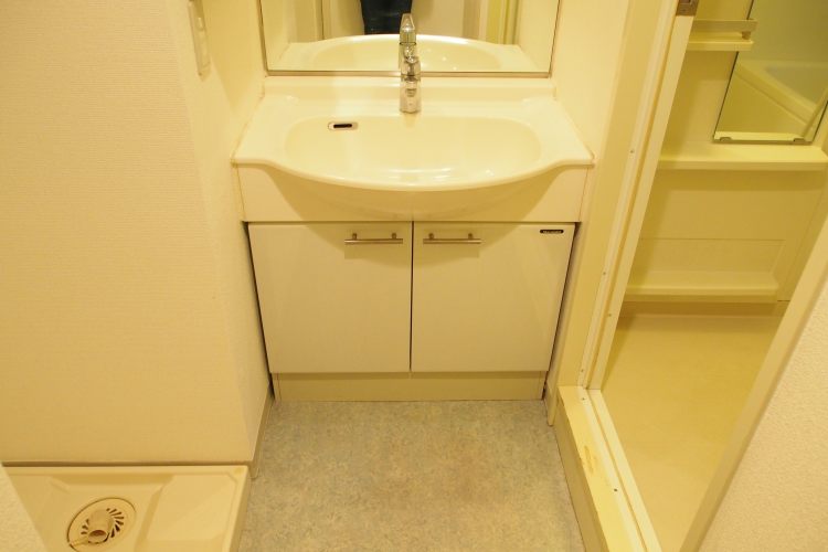 洗面台の横にも収納が付いている、収納力がある独立洗面台が付いています。