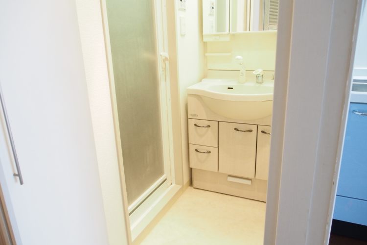 • 収納力たっぷりの独立洗面台。ハンドシャワー付きです。広めの脱衣所スペースもあります。