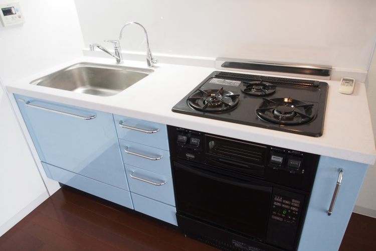 • 充実したキッチン設備です。3口ガスコンロが付いています。キッチン下にはなんとオーブンが。