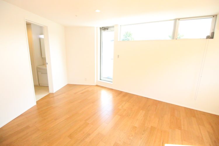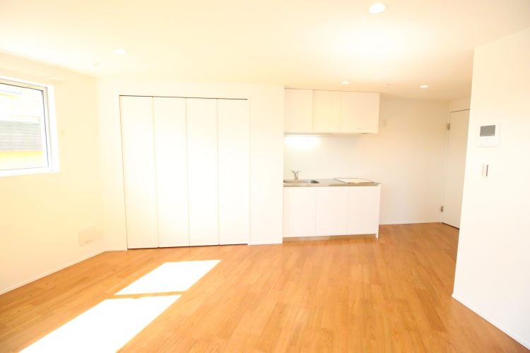 ダウンライトで照らされた室内に、フローリングの床が広がり、どんな家具も合わせやすいデザインです。