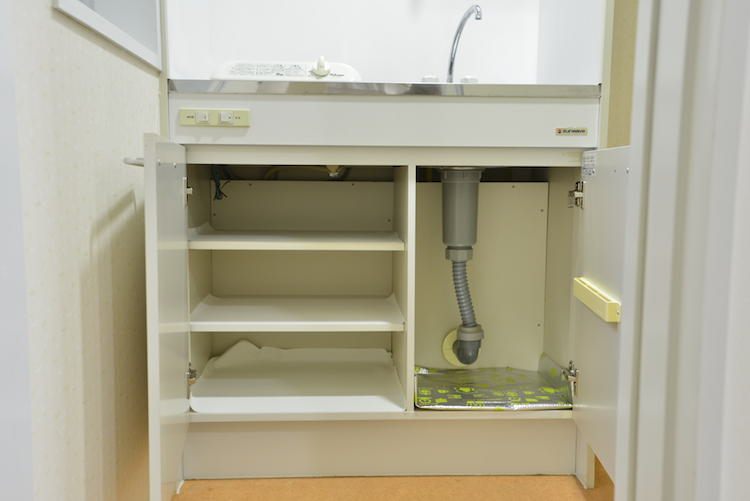 • キッチンは1口ガスコンロ。キッチン下の収納は区分けされています。