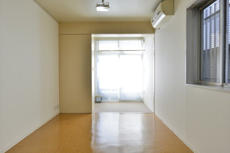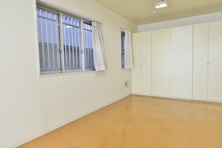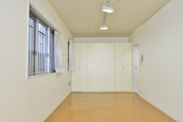 • 居室は1Kタイプ。奥の壁一面に収納が設置されています。