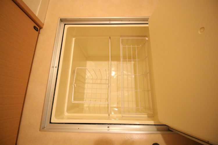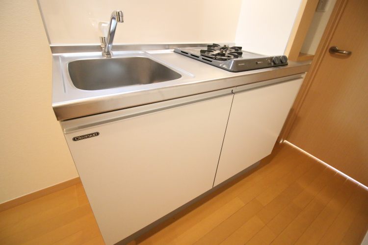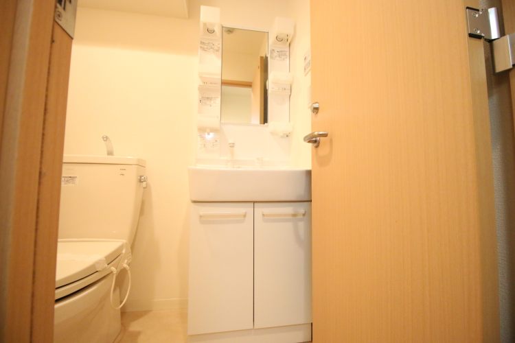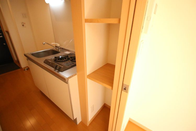 ② 設備が揃っています。ハンドシャワー付きの独立洗面台、キッチンは2口ガスコンロ、浴室は浴室乾燥機・追い焚機能が付いています。室内物干が設置されているのも嬉しいポイント。収納箇所も多く、トイレ上収納や床下収納、キッチン横にも収納場所があります。