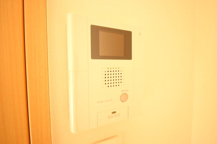① セキュリティがしっかりしています。共用エントランスのオートロック、居室のダブルロック、TVモニター付きインターフォンが設置されています。