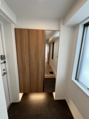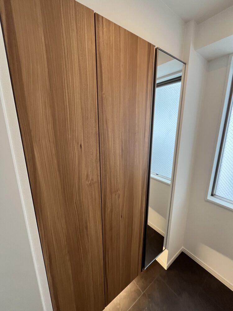 ぬくもりのある木目調のシューズボックス。扉の一枚が鏡になっていることで、視覚的な開放感を演出。