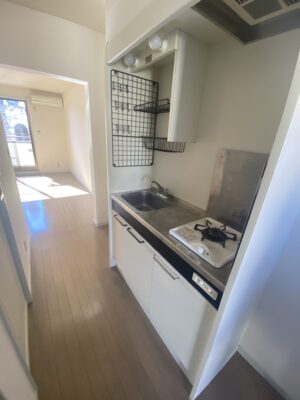 一人暮らしにちょうどいいスマートキッチン。便利な上部ラックもあり、毎日の料理もスムーズにこなせます。