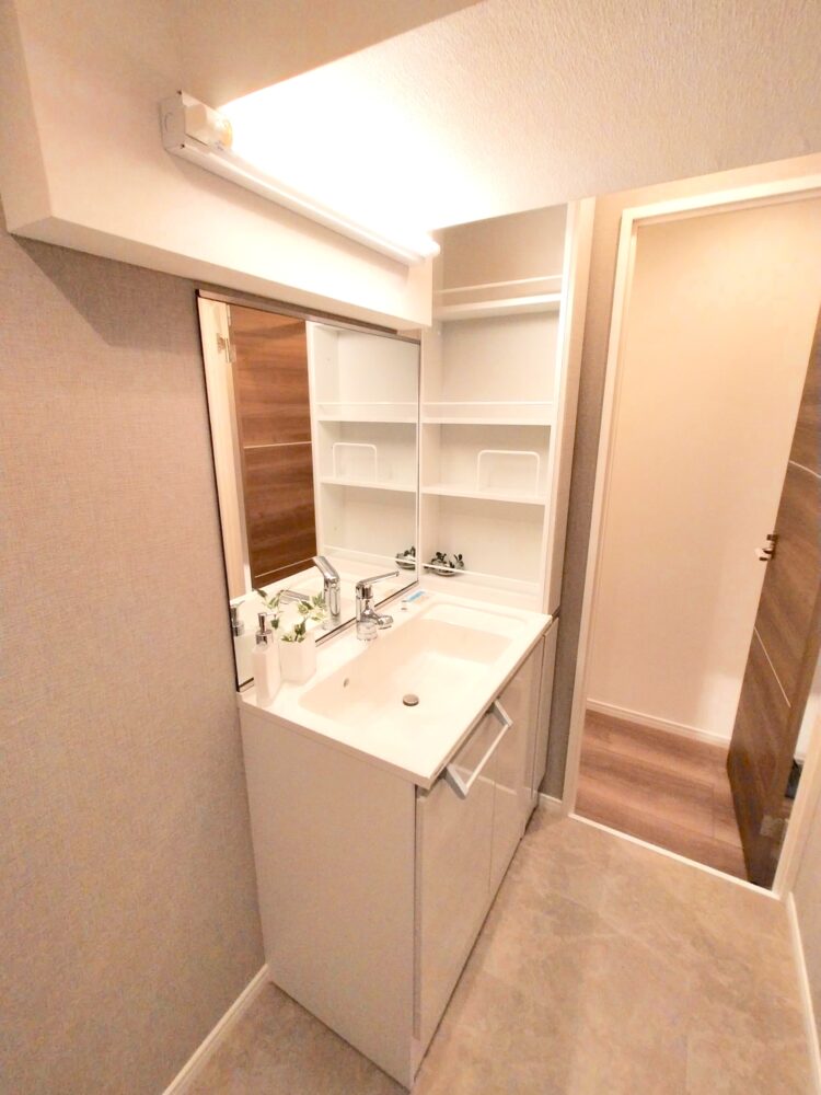 清潔感あふれる明るいパウダールーム。小物がサッと手に取れるオープン収納が、忙しい毎日をサポート。