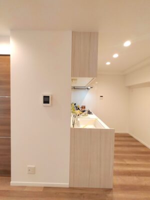 入口やリビング側からキッチンを視界に入れない、スッキリと優雅な配置。