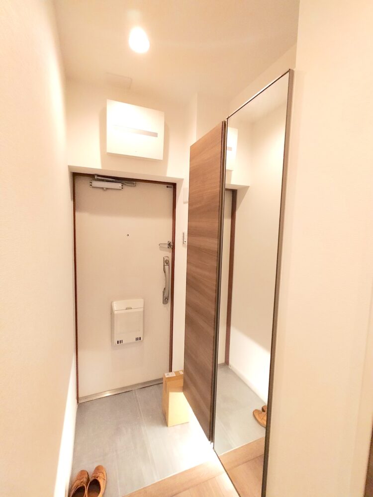 壁一面の収納で玄関をいつも美しく。大きな鏡が空間に開放感と品格を添えます。