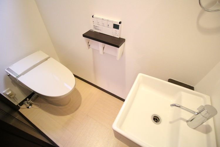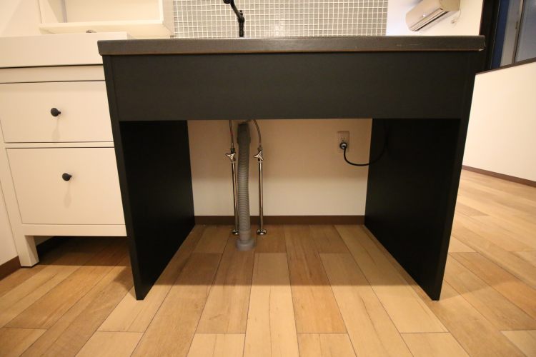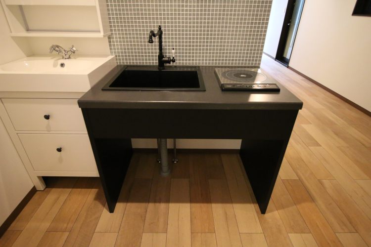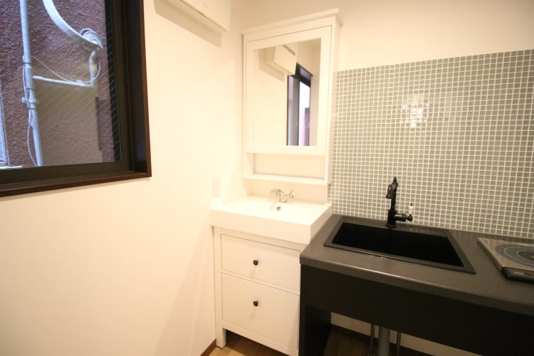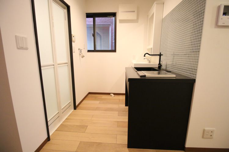 室内は床材に無垢材が用いられていたり、蛇口が愛らしい独立洗面台や、蒼いタイルに囲われた真っ黒なキッチン等が新設されていたり、一つ一つ部屋を造り上げている要素がとてもオシャレなお部屋です。