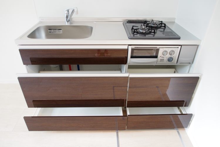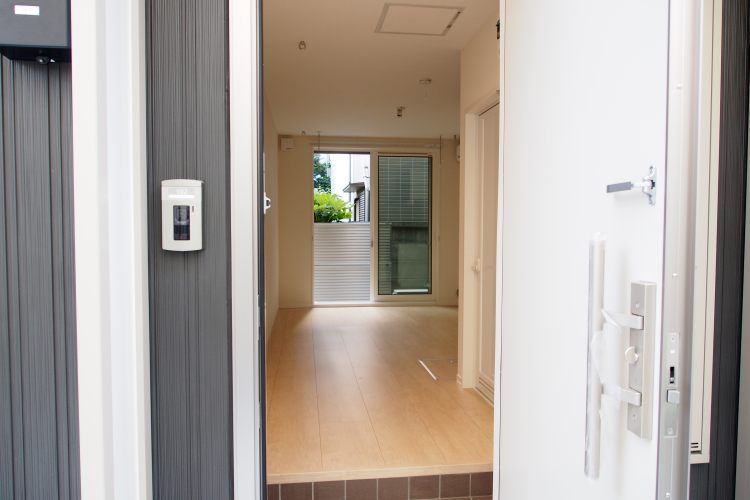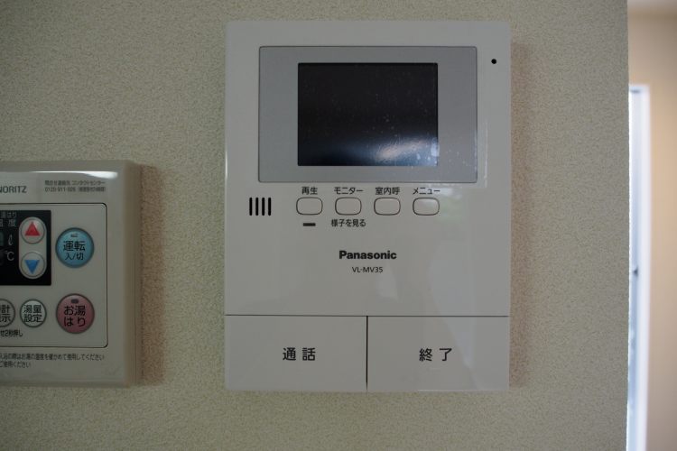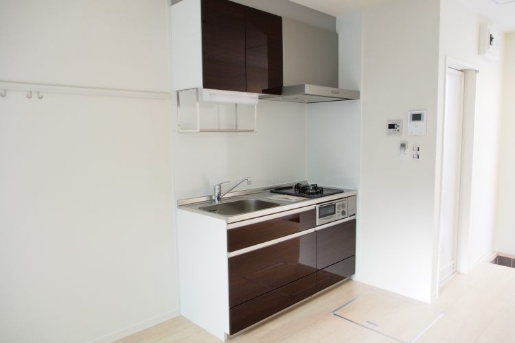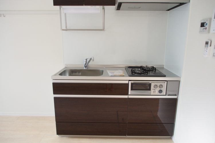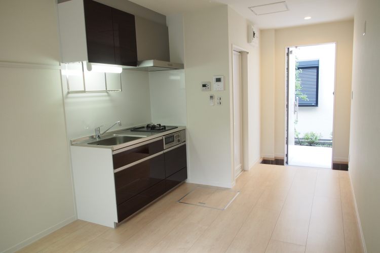 室内に入ると、新築はやっぱり綺麗です。真っ白な壁に薄茶のフローリング。このカラーテイストでしたらどんな家具や雑貨も映えそうです。また、料理好きの方には嬉しい、設備充実のキッチンが設置されています。2口ガスコンロ、グリル・レンジフード付きです。