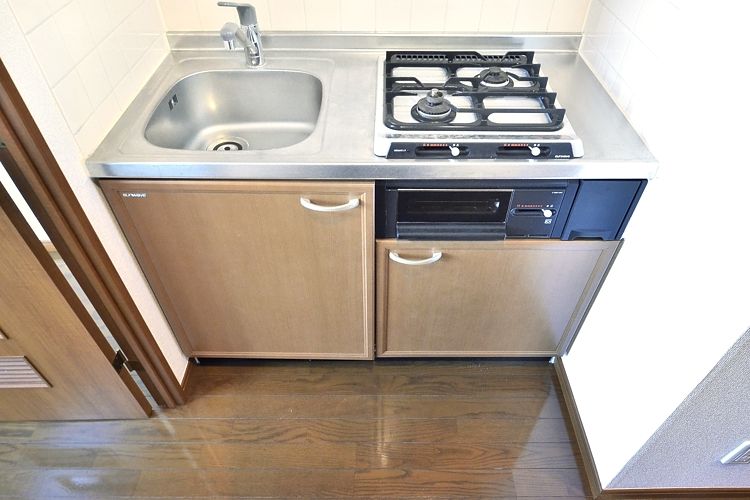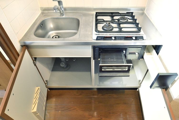 • キッチン下には調味料用収納・包丁入れ・グリルが付いています。ひとり暮らしのキッチンでグリル付きは嬉しいポイントです。