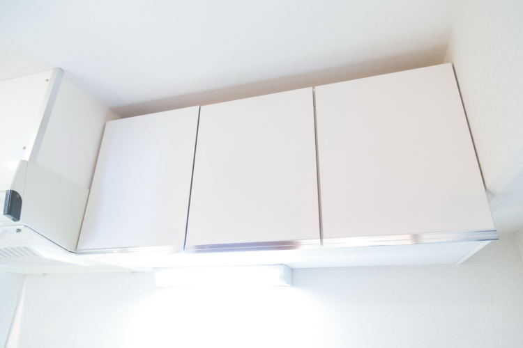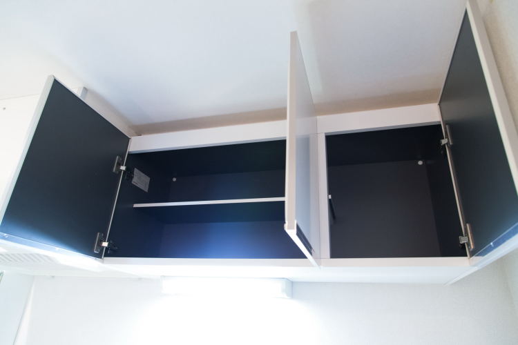 • 上にも広々とした収納スペースが付いています。レンジフードもしっかりしています。