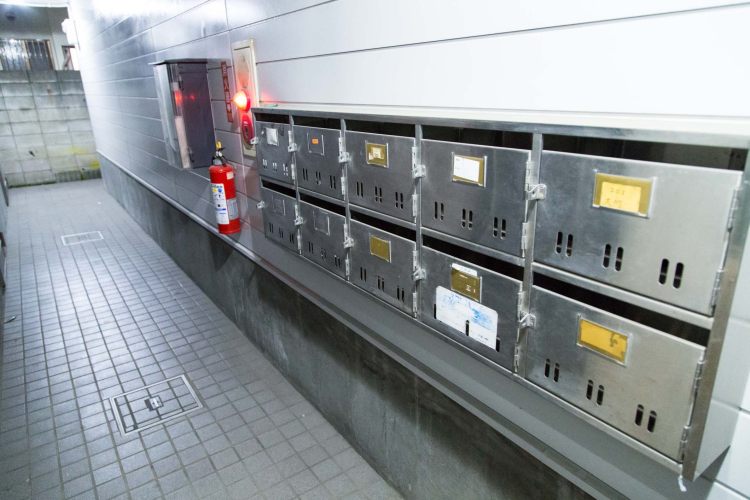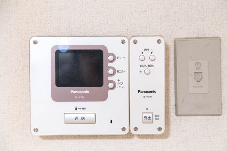 • 建物の共用エントランスはオートロックです。各居室のインターフォン子機が写真左側に全戸分付いています。