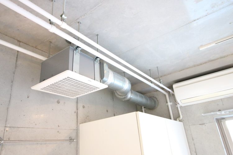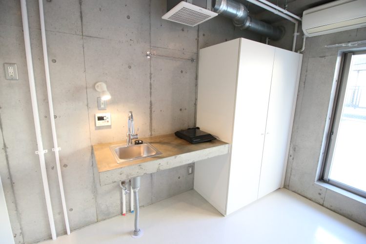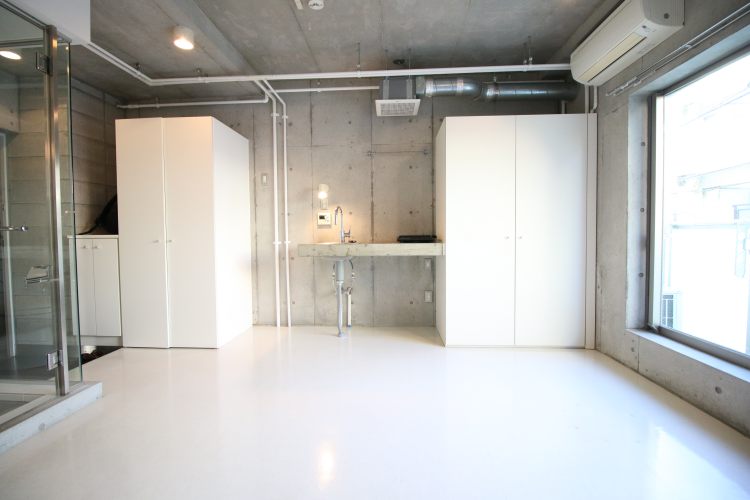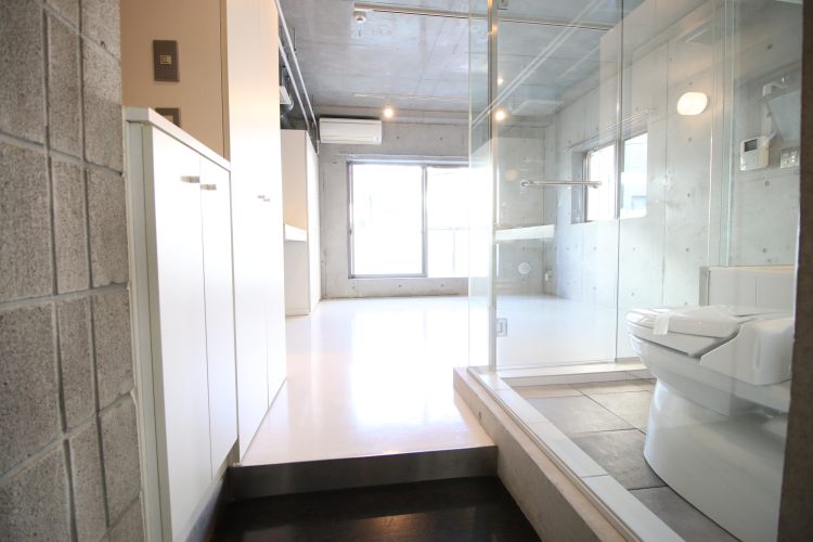 ドアを開けて、おぉ・・・。一言つい出てしまいました。外観も内装もコンクリート打ちっぱなしのデザイナーズマンション。今回はコンクリート打ちっぱなしに加えて、水周りがガラス張りに囲われ、ダクトレール付きの照明デザインが、さらにスタイリッシュさを引き立てています。むき出しの配線ダクトや換気扇、ほぉ・・・。撮影しながら、思わずため息が漏れてしまいました。