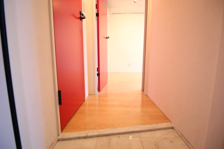 ・コンクリート打ちっぱなしに窓がはめ込まれた美しい外観です。室内は一部、コンクリートが用いられ、床はフローリング。扉はワンポイントカラーとして赤色が利用されています。