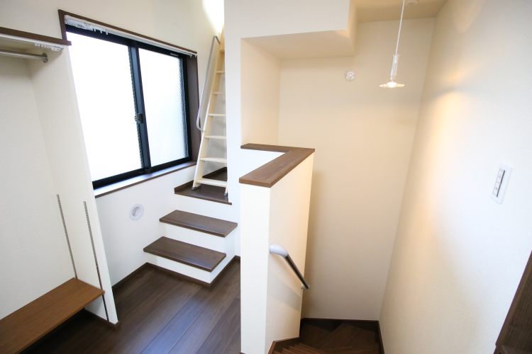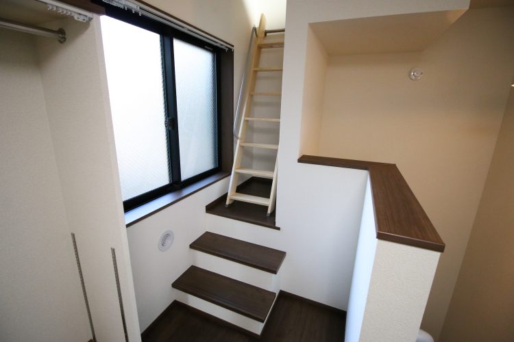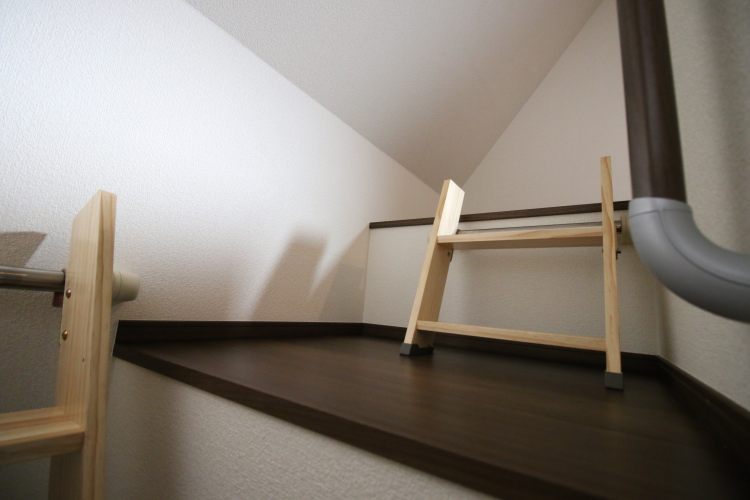 先ず、1階にエントランスがあり、階段を上っていくと2階はリビング、その上に更に階段があり、3階は寝室として用いる事が出来るロフトが設置されています。また、ロフト横にはちょっとした小部屋スペースが。なんだかとても面白い造りをしています。